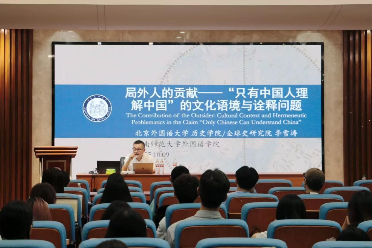 On the evening of October 10, 2025, Professor Li Xuetao, Dean of the School of History and Culture at Beijing Foreign Studies University, was invited to Hunan Normal University to deliver a special lecture titled “The Contribution of the Outsider: The Cultural Context and Hermeneutic Issues of ‘Only the Chinese Understand China.’” The lecture was part of the 3rd Humboldt Day International Forum, “Humboldt’s Cosmos: Ethics and Aesthetics,” and aimed to introduce faculty and students to cutting-edge perspectives and critical questions in contemporary Humboldt studies. Held in Room 515 of Tenglong Building at the School of Foreign Studies and hosted by Professor Xiao Huafeng, the event attracted a full house and fostered a vibrant academic atmosphere.