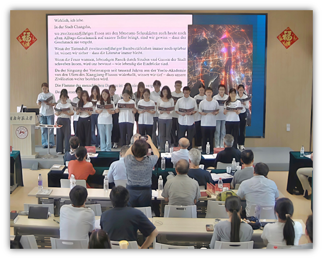 On the morning of October 11, 2025, marking the 53rd anniversary of the establishment of diplomatic relations between China and Germany, the Third “Humboldt Day” International Forum welcomed a cross-linguistic and cross-disciplinary feast of world literature and culture in Changsha, the “Star City.” Bathed in the gentle light of late summer and framed by the verdant scenery of Yuelu Mountain, the 613 multifunction hall of Tenglong Building was filled to capacity. Leading scholars from China and abroad gathered for the occasion, while students of the German Studies program at our university presented a meticulously choreographed collective recitation of Die zerbrochene Zunge (The Broken Tongue), an as-yet-unpublished novel by the renowned scholar Professor Ottmar Ette. With youthful voices, the students built a vibrant bridge of humanistic exchange between China and Germany.